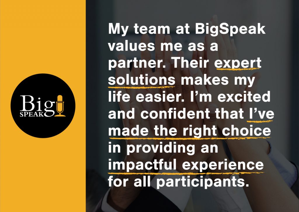 Headquartered in beautiful Santa Barbara, California, with team in Arizona, Texas, North Dakota, Tennessee, Florida, Virginia, and Massachusetts, to better serve you. BigSpeak is a full-spectrum speakers bureau, representing the world’s finest motivational keynote speakers, consultants, experts, trainers, vanguard thought-leaders, world-class athletes, bestselling authors, award-winning entertainers, and global icons. For keynote speakers to inspire at your next conference, convention, retreat or gala, we invite you to search our “BigList” of Professional Speakers and view speaker videos. At BigSpeak Motivational Speakers Bureau, we realize that supporting meeting planners is key to achieving the goals of our clients, and so we also offer our meeting planner tools to guide you in creating, planning, organizing and staging the best event possible.